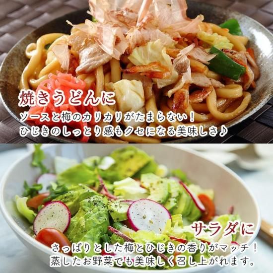 原材料名 かりかり梅(国産)、ひじき、食塩、砂糖、果糖ぶどう糖液糖、ごま、米発酵調味料、醸造酢、しそ梅酢、たん白加水分解物、酵母エキス、ホタテエキス、昆布粉末、香辛料/酒精、酸味料、調味料(アミノ酸等)、しそ香料、ビタミンB1、着色料(赤色102号)、※一部にごまを含む※ひじきは韓国産を使用。