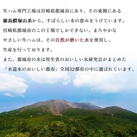 生ハム専門工場は宮崎県都城市にあり、その東側にある霧島鰐塚山系から、その自然が磨いた水を使用し、生ハムを生産しております。