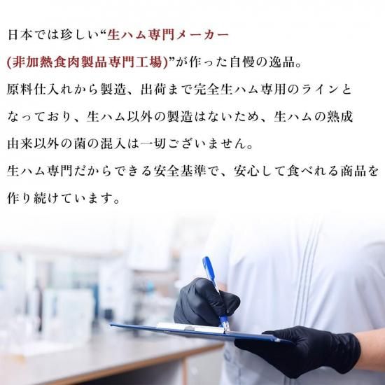 日本では珍しい生ハム専門メーカー(非加熱食肉製品専門工場)が作った自慢の逸品。原料仕入れから製造、出荷まで完全生ハム専用ラインとなっており、生ハム以外の製造はないため、生ハム熟成由来以外の菌の混入は一切ございません。